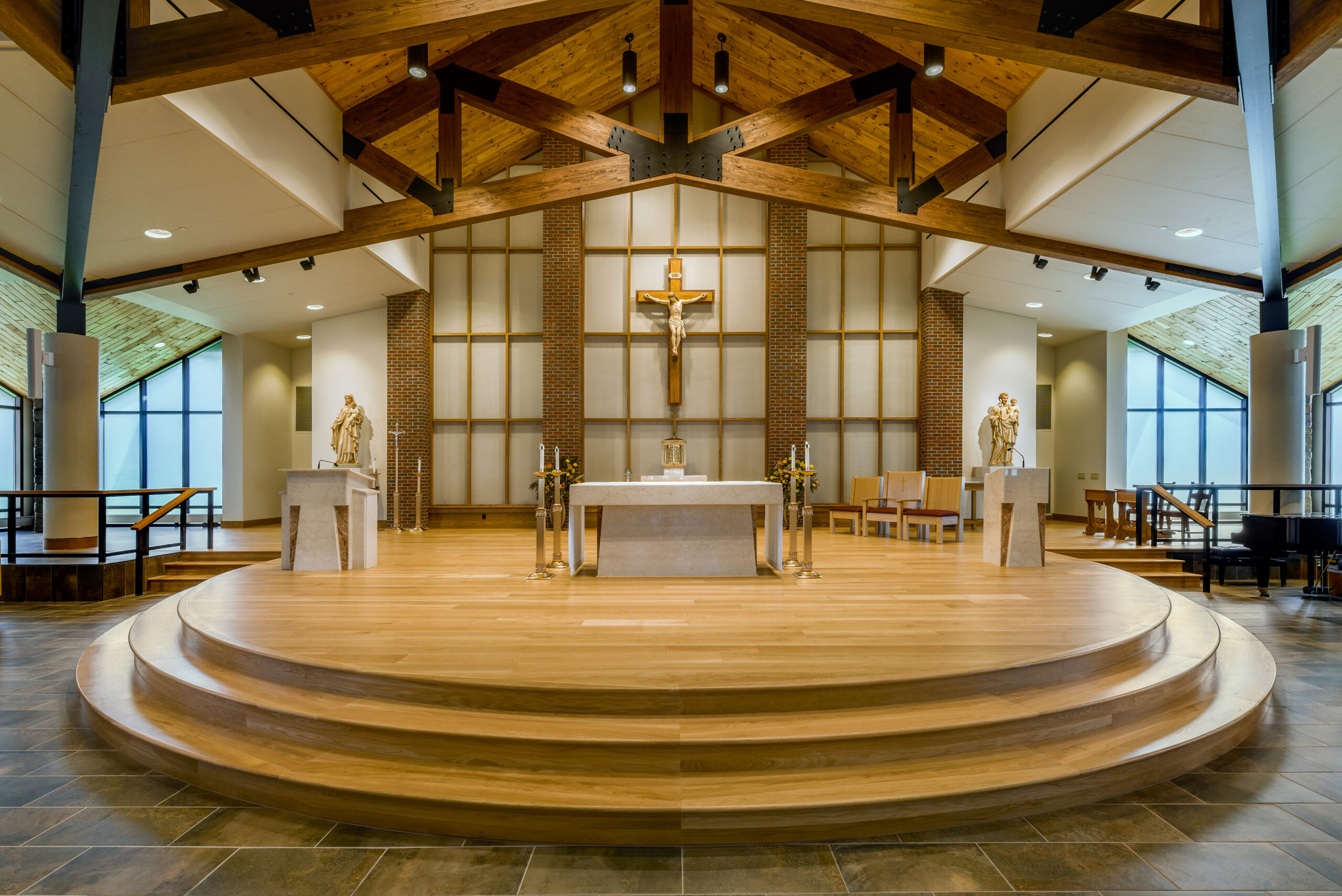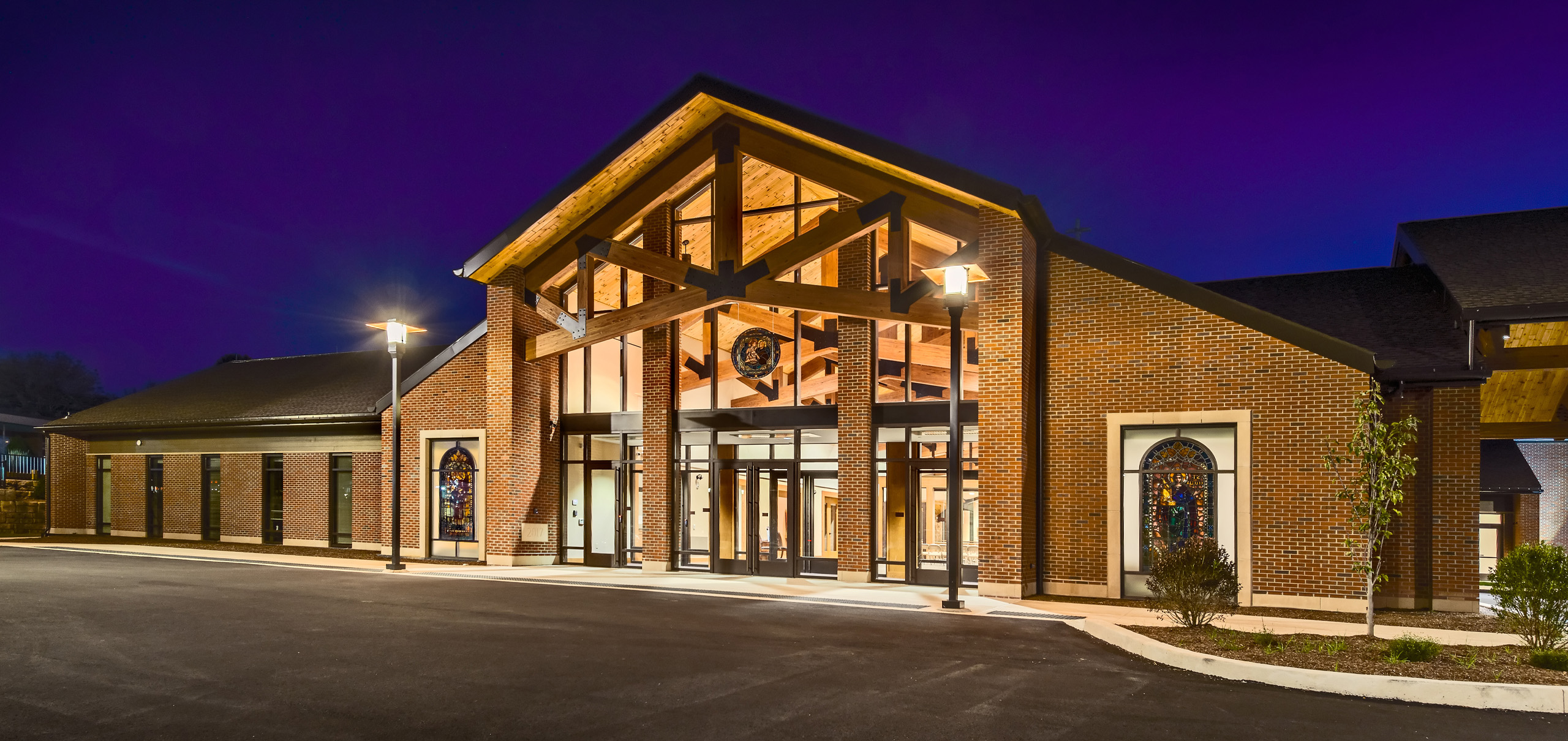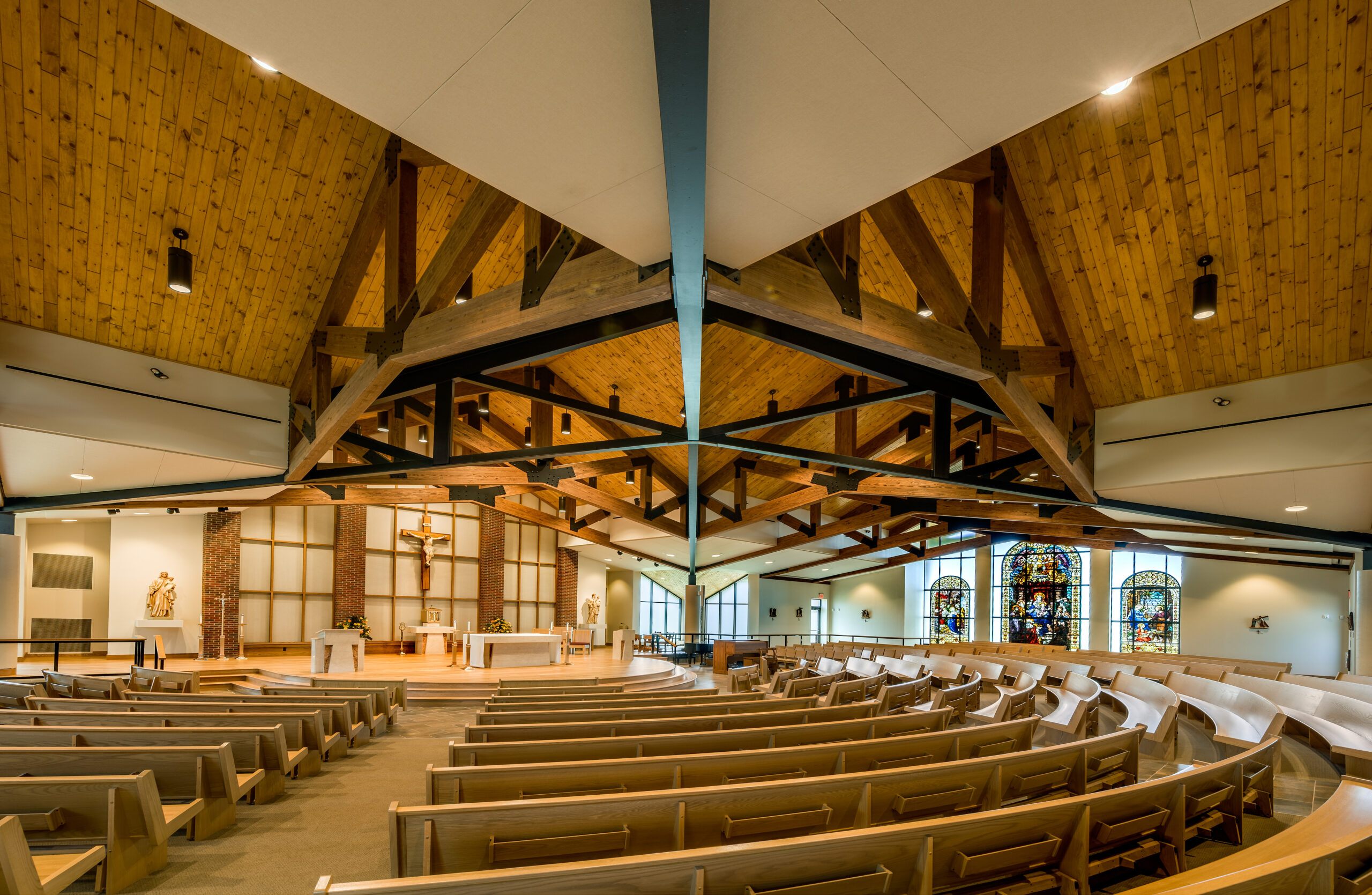 The parish of St. Jude replaced their existing church and administrative center with a new structure that better addresses the spatial and liturgical needs of the parish for the 21st century. The new church combines traditional church form with a post-Vatican II seating plan and accommodates 830 congregants. The church’s cruciform plan culminates in a central dome; the amphitheater-style seating forms a dished hemicycle. Similarly, traditional brick-clad sidewalls contrast with fully-glazed end walls, creating a light-filled sanctuary. Continuing this expression of contrasting the traditional with the new, historic stained glass windows were inserted into the glazed end walls and separated by stone-clad piers.