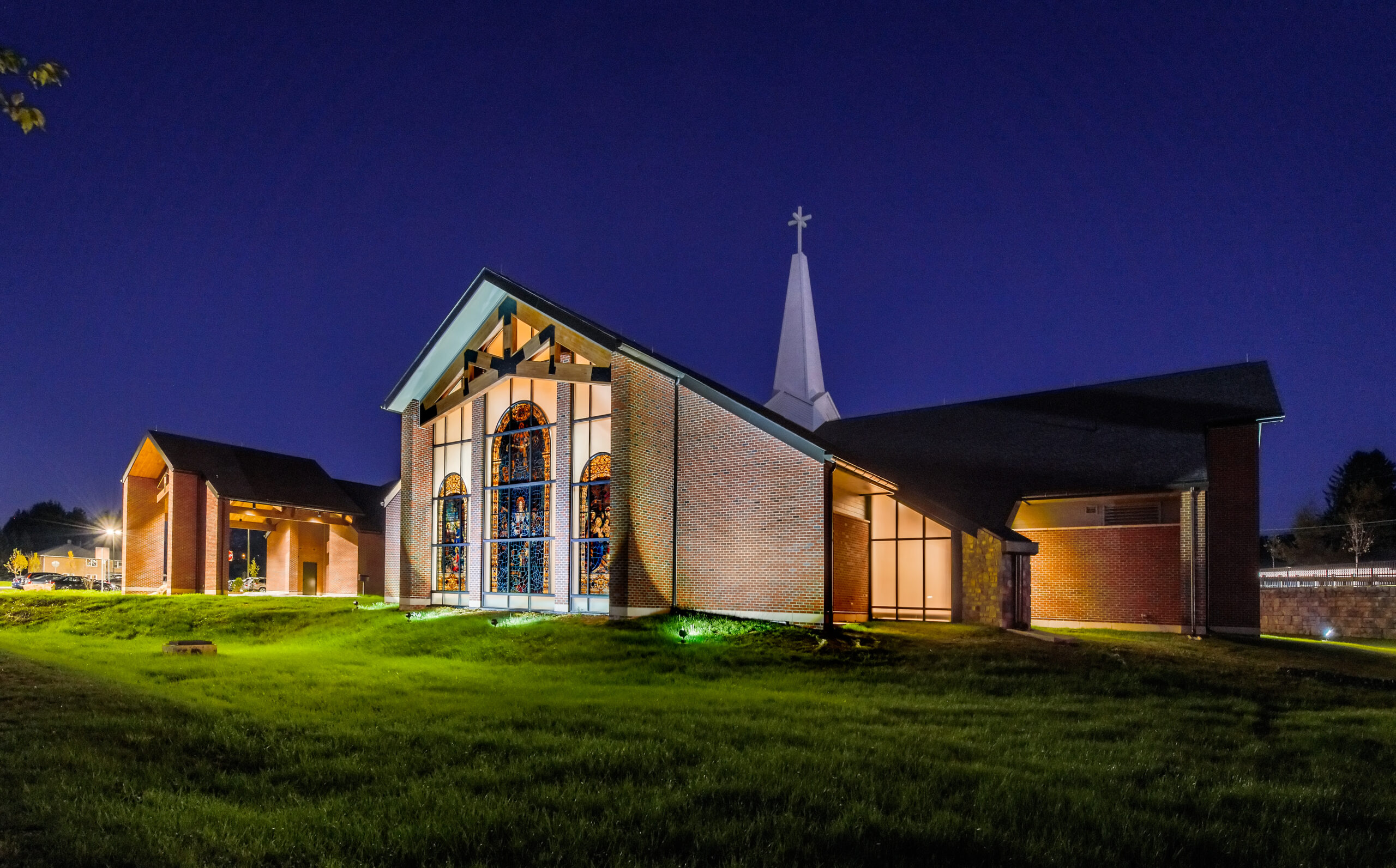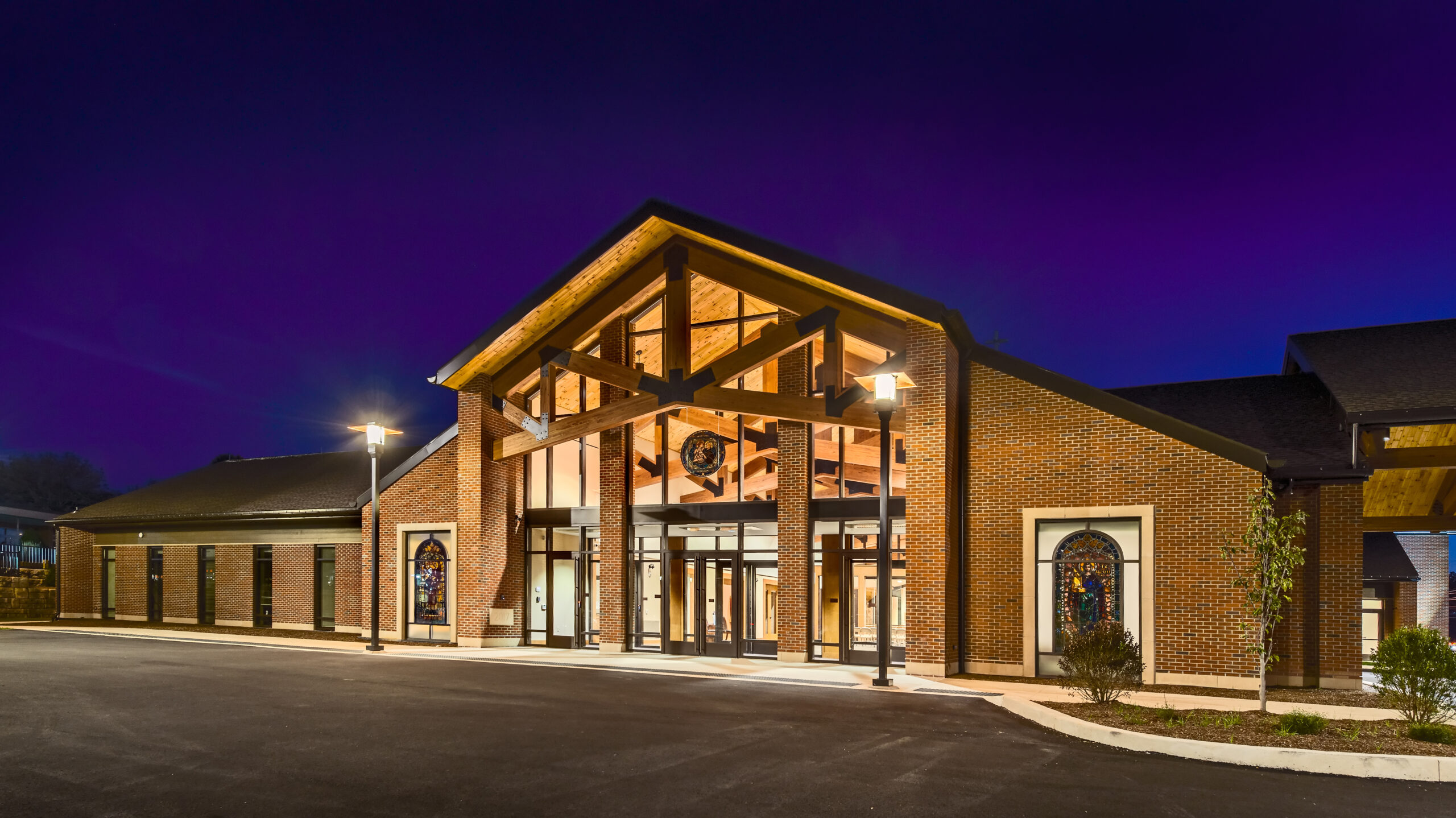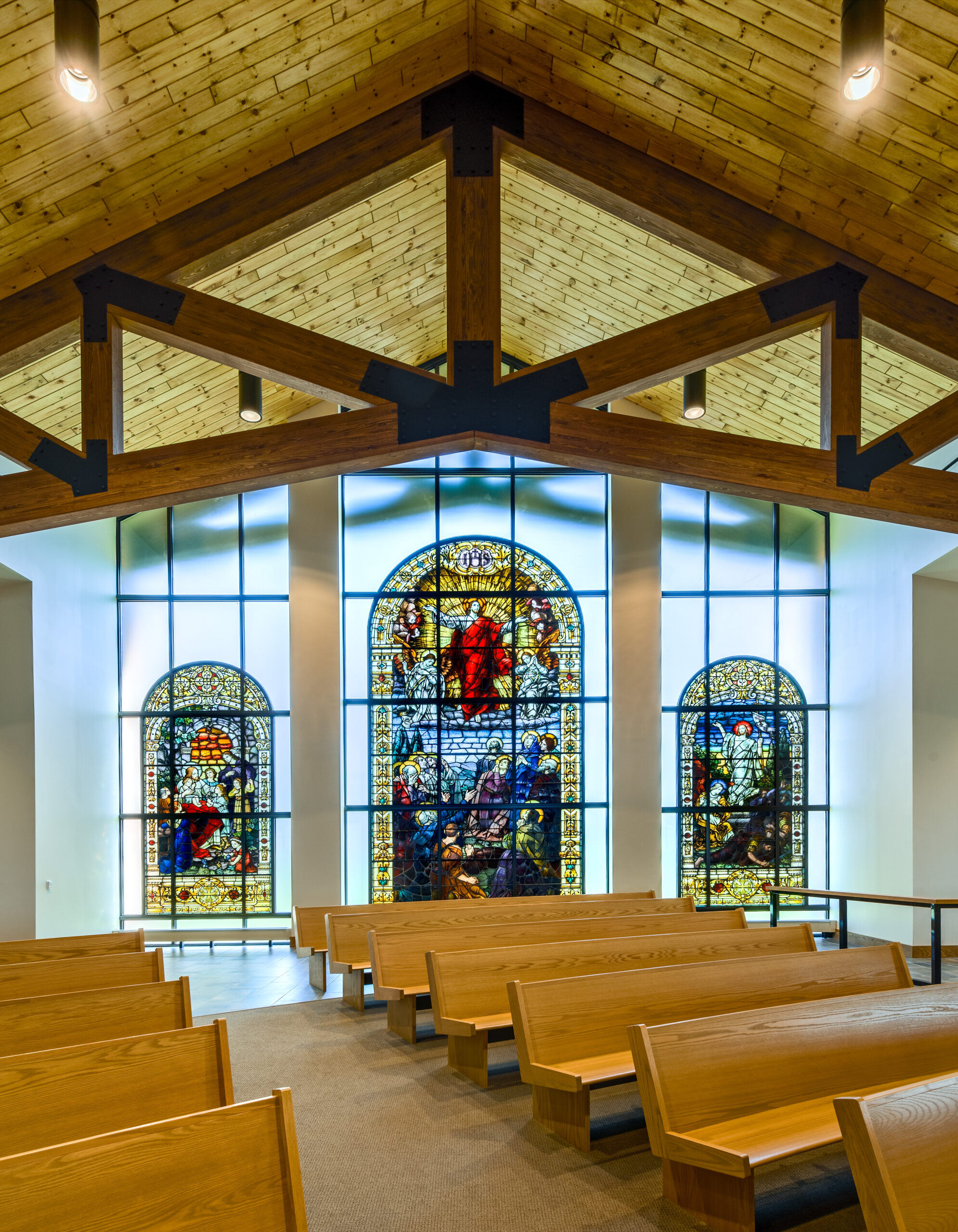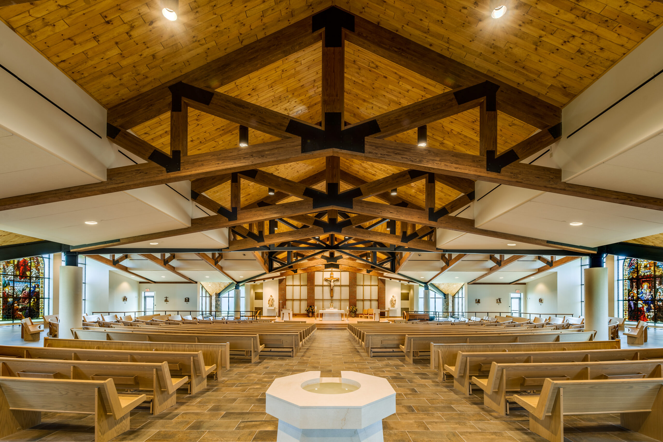 The parish of St. Jude replaced their existing church and administrative center with a new structure that better addresses the spatial and liturgical needs of the parish for the 21st century. The new church combines traditional church form with a post-Vatican II seating plan and accommodates 830 congregants. The church’s cruciform plan culminates in a central dome; the amphitheater-style seating forms a dished hemicycle. Similarly, traditional brick-clad sidewalls contrast with fully-glazed end walls, creating a light-filled sanctuary. Continuing this expression of contrasting the traditional with the new, historic stained glass windows were inserted into the glazed end walls and separated by stone-clad piers.